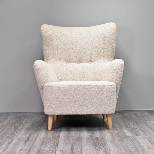 Kaunis Emilia lepotuoli miellyttävän pehmeällä kankaalla. Valittavissa kahdessa eri sävyssä, okran keltainen tai hillitty pellava. Tuoliin on tilattavissa myös rahi samalla kankaalla.