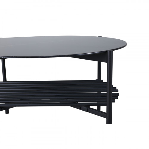 Pyöreä sohvapöytä tekee vaikutuksen modernilla ja teollisella muotoilullaan, joka taatusti herättää huomioita ja luo tyylikkään tunnelman olohuoneeseen. Ajaton musta väri sulautuu helposti useimpiin sisustustyyleihin, kansi on ohutta kaunista marmorilasia ja koristekehys mustaa metallia. Kannen alla on käytännöllinen hylly.