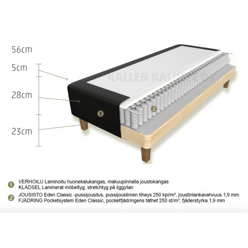 Eden 1 on perus laadukas kotimainen runkopatja. Eden runkopatjassa on napakka pussijousitus, joka myötäilee hyvin vartaloa. Runkopatja on jäykkyydeltään napakka. Sänky on verhoiltu tyylikkäällä laminoidulla huonekalukankaalla, makuupinnoilla valkoinen joustokangas. Runkopatja sisältää 5cm vahvuisen petauspatja jonka päälliset on irrotettavissa ja pestävissä. Hinta sisältää 23 cm korkeat altaruuvattavat jalat.