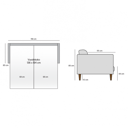 Leveys 156 cm, syvyys 85 cm, korkeus 85 cm