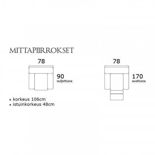 Koko: Leveys 78 cm, syvyys 90 cm, korkeus 106 cm
