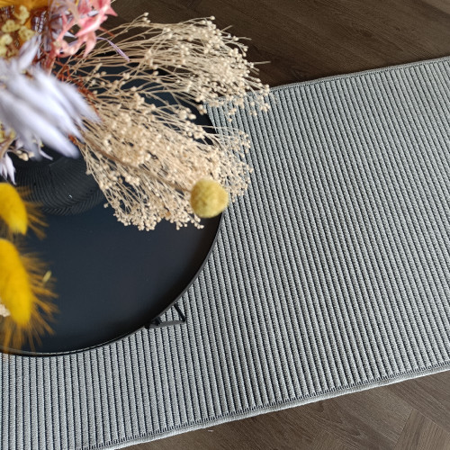 Aura-matto on helppohoitoinen ja vesipestävä vaihtoehto, joka sopii lähes kaikkiin kodin tiloihin. Sen sileäpintainen rakenne tekee siitä käytännöllisen valinnan niin eteiseen, olohuoneeseen kuin keittiön pöydän alle. Pelkistetty ja ajaton kuosi yhdistyy helposti kodin muuhun sisustukseen, ja hillitty raitakuvio tuo mattoon ryhtiä ja elävyyttä.