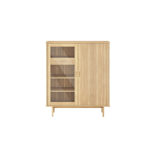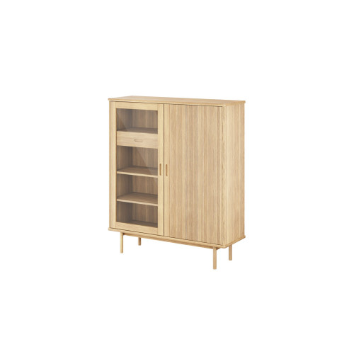 Kaappi on valmistettu laadukkaasta massiivitammesta ja siinä on integroidut kahvat. Kokonaisuus koostuu yhdestä uritetusta ovesta ja yhdestä lasiovesta, jotka molemmat sulkeutuvat pehmeästi. Lasioven takaa löytyy vasemmalta laatikko pienten tavaroiden säilytykseen. Ovien takana on kolme hyllyä, joista kaksi säädettävää, jotta tilankäyttö voidaan mukauttaa omien tarpeiden mukaan.