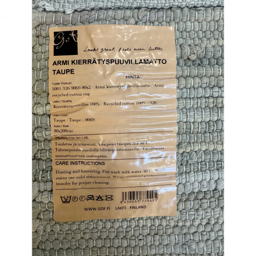 Armi-puuvillamatto on kaunis ja käytännöllinen matto, joka on valmistettu 100 % kierrätyspuuvillasta. Tämä vastuullinen valinta tuo kotiin luonnollista tunnelmaa ja kestävää mukavuutta. Armi-matto sopii täydellisesti esimerkiksi olohuoneeseen, keittiöön tai makuuhuoneeseen, ja sen ajaton ilme istuu monenlaiseen sisustukseen.