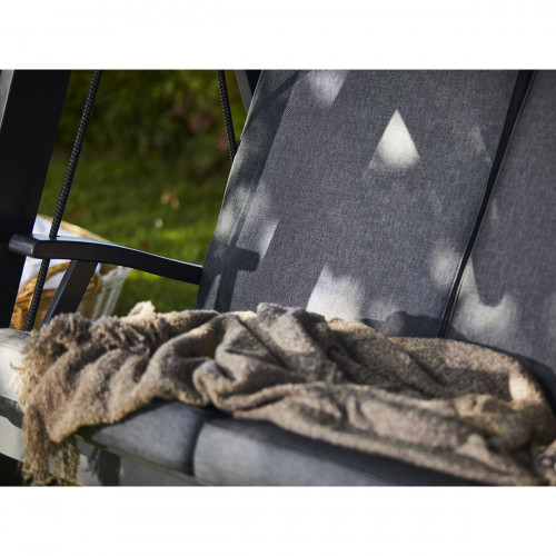 Keinun katos ja pehmusteet on verhoiltu mustalla Panama-kankaalla, joka on 100 % kierrätettyä polyesterisekoitusta. Kangas on erittäin kestävä, vettä hylkivä ja antibakteerinen, mikä tekee siitä erinomaisen ulkokäyttöön. Materiaali kestää hyvin myös kloorattua vettä, joten keinu sopii loistavasti sijoitettavaksi esimerkiksi uima-altaan tai porealtaan läheisyyteen.