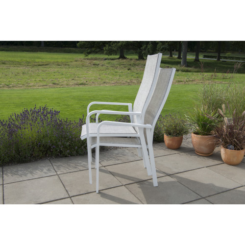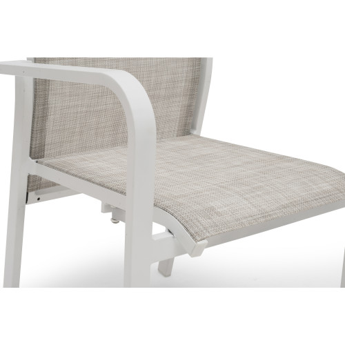 Istuinosan Textilene-kangas mukautuu miellyttävästi kehon mukaan ja tekee istumisesta kevyen ja hengittävän kokemuksen myös lämpiminä päivinä. Tuoli on lisäksi pinottava, mikä helpottaa säilytystä ja säästää tilaa.