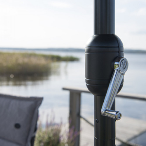 Suuri aurinkovarjo alumiinirungolla jossa on kallistus ja veivi, jonka ansiosta varjo on helppo taittaa ylös ja alas. Kallistuksella voit käyttää varjoa myös illalla tai aikaisin aamulla, kun aurinko on matalalla.
