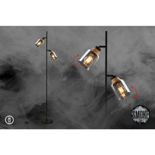 Moderni ja luonnonläheinen E.Lite Royk -lattiavalaisin yhdistää mustan metallin ja puun sävyt kauniiksi kokonaisuudeksi. Kaksi savulasista varjostinta levittävät pehmeää, lämmintä valoa ja tuovat tilaan tunnelmaa ilman häikäisyä.